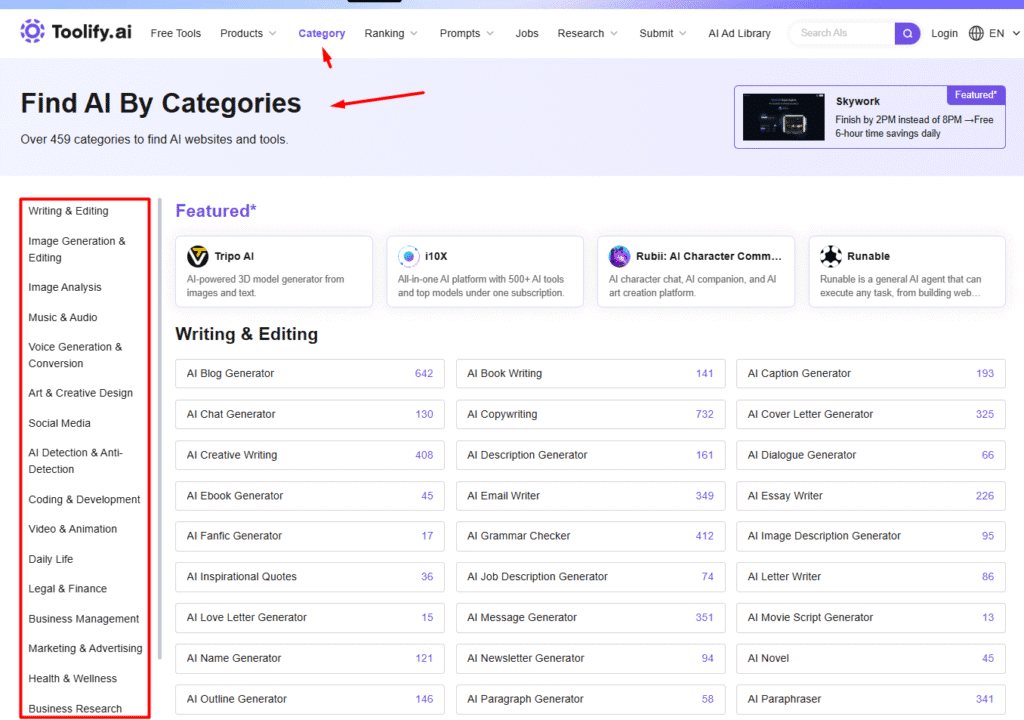 For users seeking the best performance and highest reliability, the Top AI Ranking function by category is indispensable. By filtering, for example, by Image Generation and Editing, the platform lists the highest-rated and most used AIs, such as OpenAI, Adobe, and Grock.