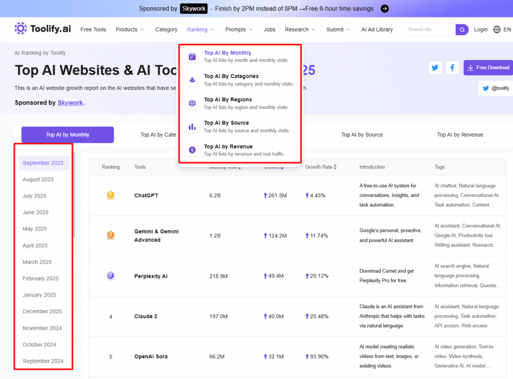The Web Insights functionality allows users to view the monthly traffic of a specific AI. For example, knowing that a leading tool (like Adobe or OpenAI in their categories) has monthly traffic of 620,000 visits is a clear indicator of its popularity, reliability, and market demand. This metric is vital for justifying the adoption of the tool and understanding where the audience is concentrating its searches.