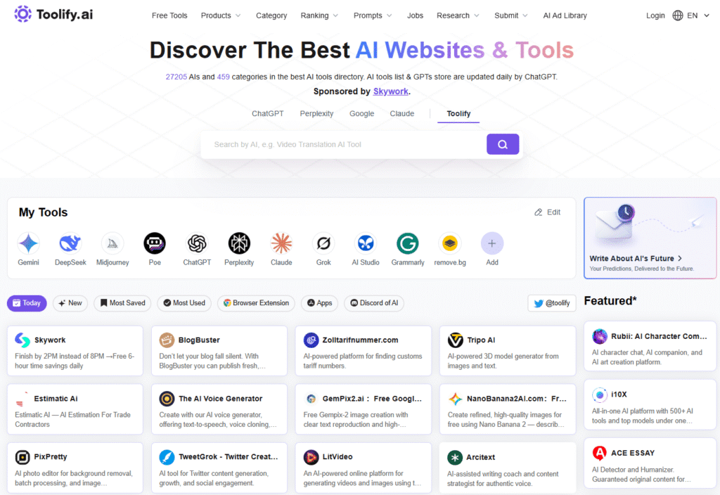 One of Tolify AI’s most strategic differentiators is the section dedicated to recently created artificial intelligences. Located on the homepage, this list is a goldmine for the content creator and early adopter.