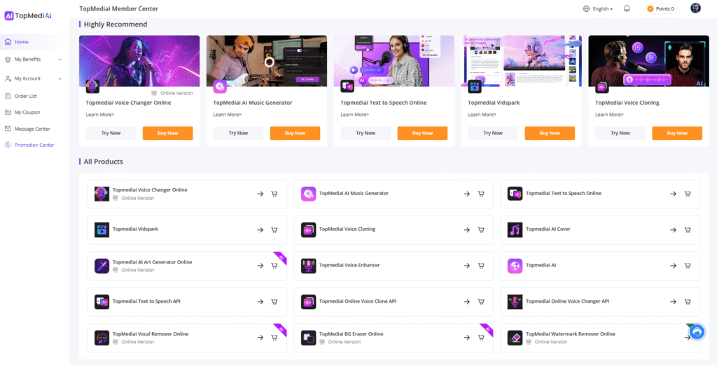 To begin exploring the capabilities of TopMedia AI, the user must access the website and log in. The starting point for all production functionalities is the Creation Hub, located within the Member Center. This hub is logically organized, dividing the tools between music production and general creative tools, ensuring that the user quickly finds the desired resource.