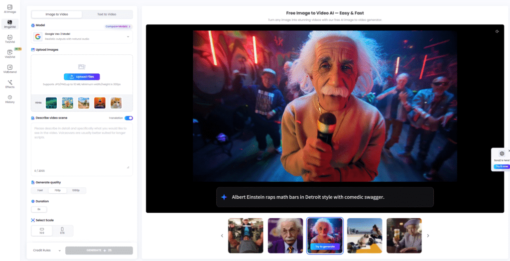 • Image to Video: This is a powerful tool for bringing static photos or illustrations to life. The user selects an image and then describes the scene or movement they want the image to perform. Available models, such as Sara 2, Google View 3.1, Vido 2.0, and Top Video 1.0, offer different animation styles. Video quality and duration are adjustable, and the creator can set the scale (portrait or landscape), which is crucial for optimizing content for different platforms (e.g., 9:16 for TikTok or 16:9 for YouTube).