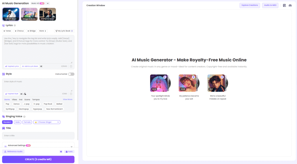 1. Lyrics to Music: The user inputs the complete lyrics and selects the desired musical style. The AI composes the melody and harmony to accompany the text.
